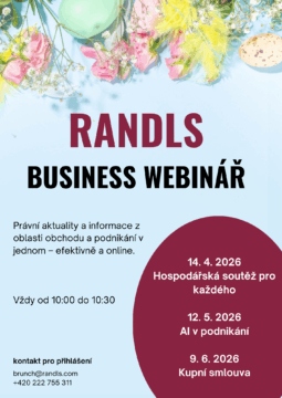 Charakteristika: Randls Business Webinář je třicetiminutový online meeting, ve kterém Vás každý měsíc efektivně a příjemnou formou provedeme nejaktuálnějšími právními tématy a seznámíme s podstatnými novinkami. Randls Business Webinář představuje dostupný prostředek, jak si skrze pravidelná online setkání osvojit důležité právní informace a neztratit přehled o aktuálním dění.