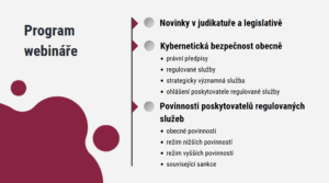 Ve webináři se zaměříme zejména na posouzení, jaké společnosti jsou a naopak nejsou poskytovateli regulovaných služeb, na koho se vztahují konkrétní povinnosti v oblasti kyberbezpečnosti, dále jak se registrovat jako poskytovatel regulované služby a jak nastavit kontaktní údaje a na co se připravit v roce 2026. Nezapomeneme ani na sankce a to, jak se jim vyhnout.